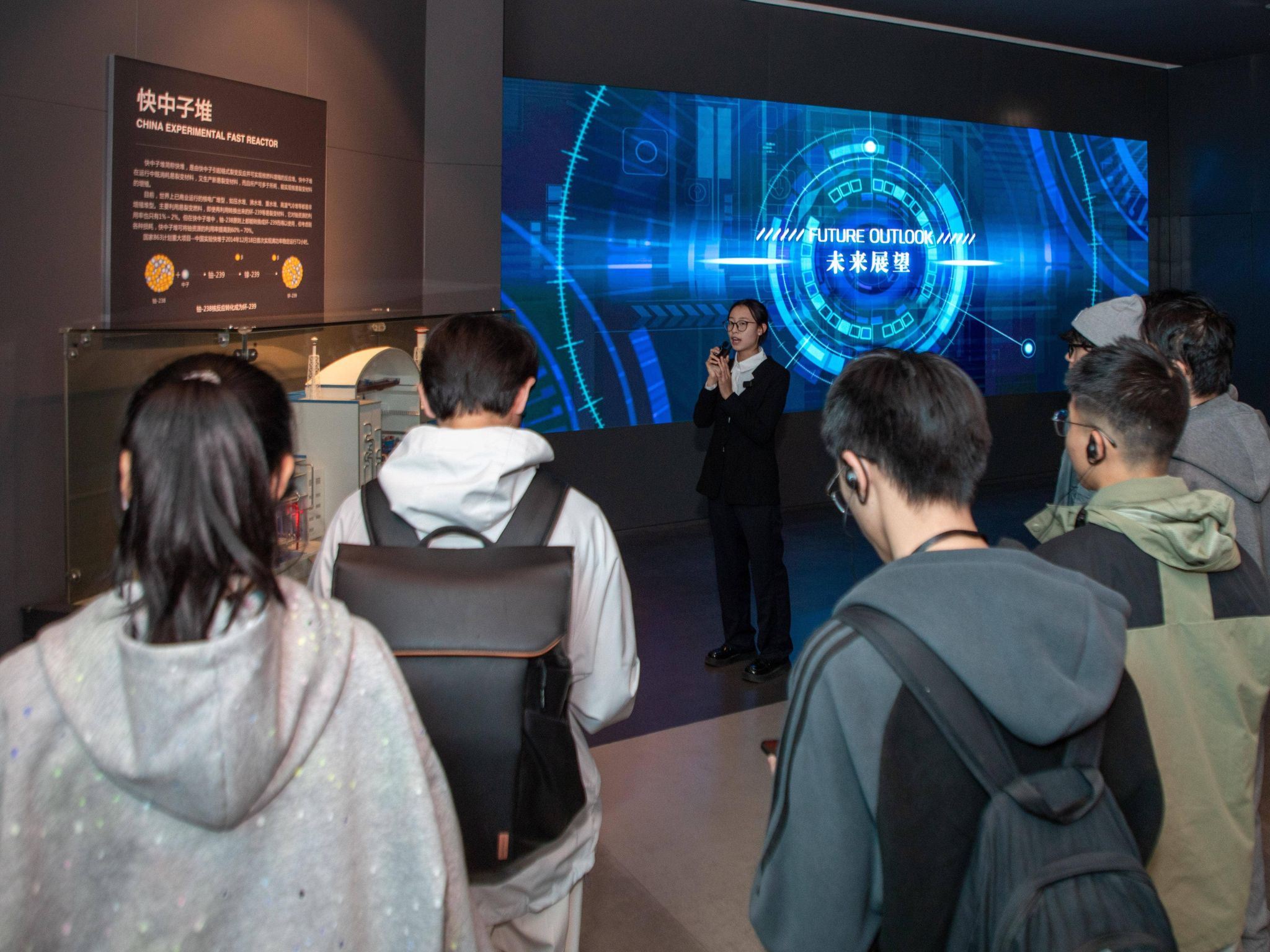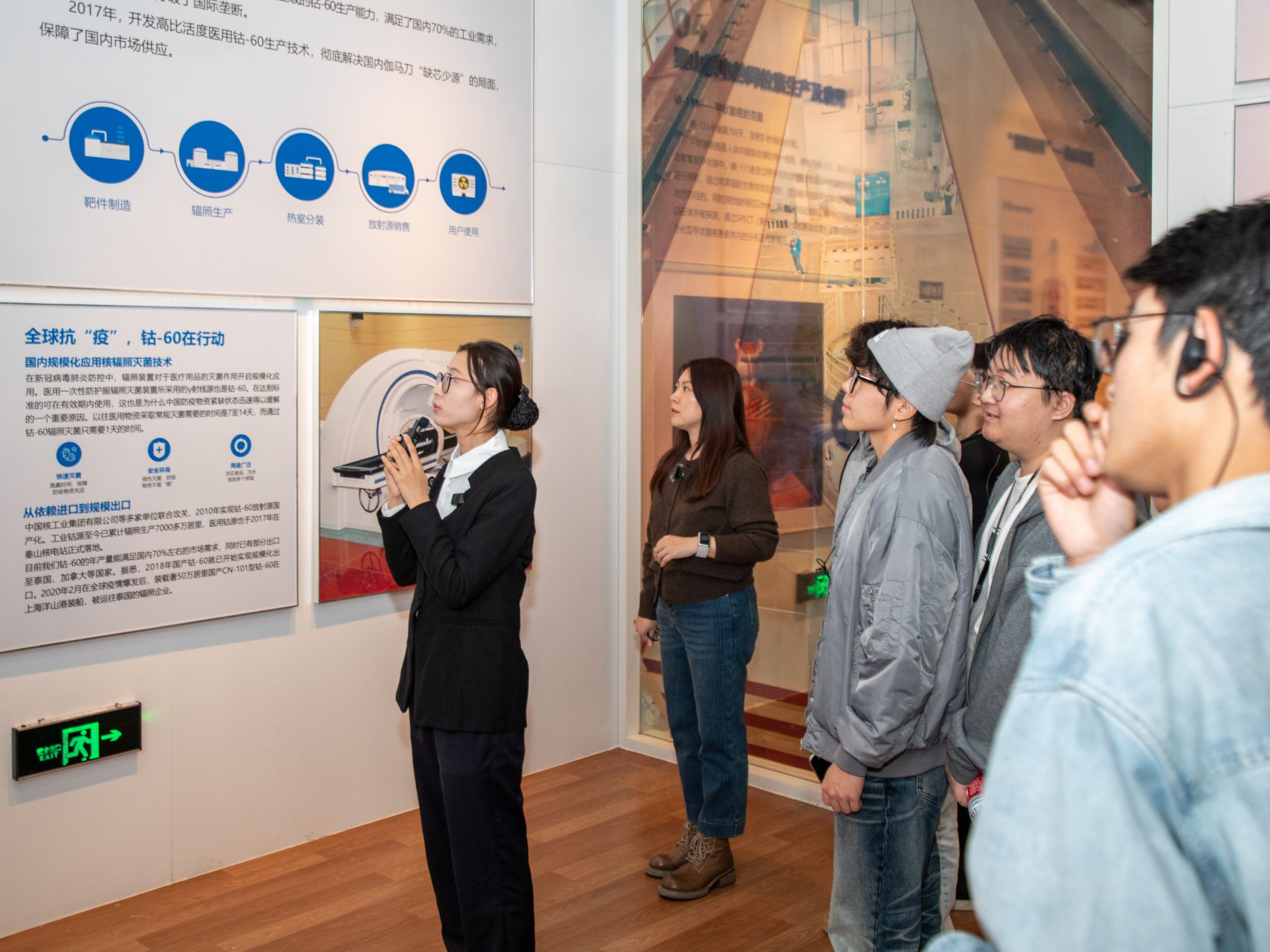 在秦山核电馆讲解老师的引导下,师生们开启了一场探寻中国核电发展史的“科技之旅”。馆内丰富的历史文物、精美的模型和先进的互动体验设施,全方位、多角度地展示了中国核电从无到有、从弱到强的“国之光荣”奋斗历程。师生们驻足于秦山核电站一期模型前,聆听“中国核电从这里起步”的创业故事;在核能知识科普区,通过生动有趣的互动装置,深入了解了核能发电的原理、安全性以及核技术在医疗、农业等领域的广泛应用。在这里,电气专业的同学们不仅拓展了专业知识,也感受到了作为“核电人”的光荣与伟大。