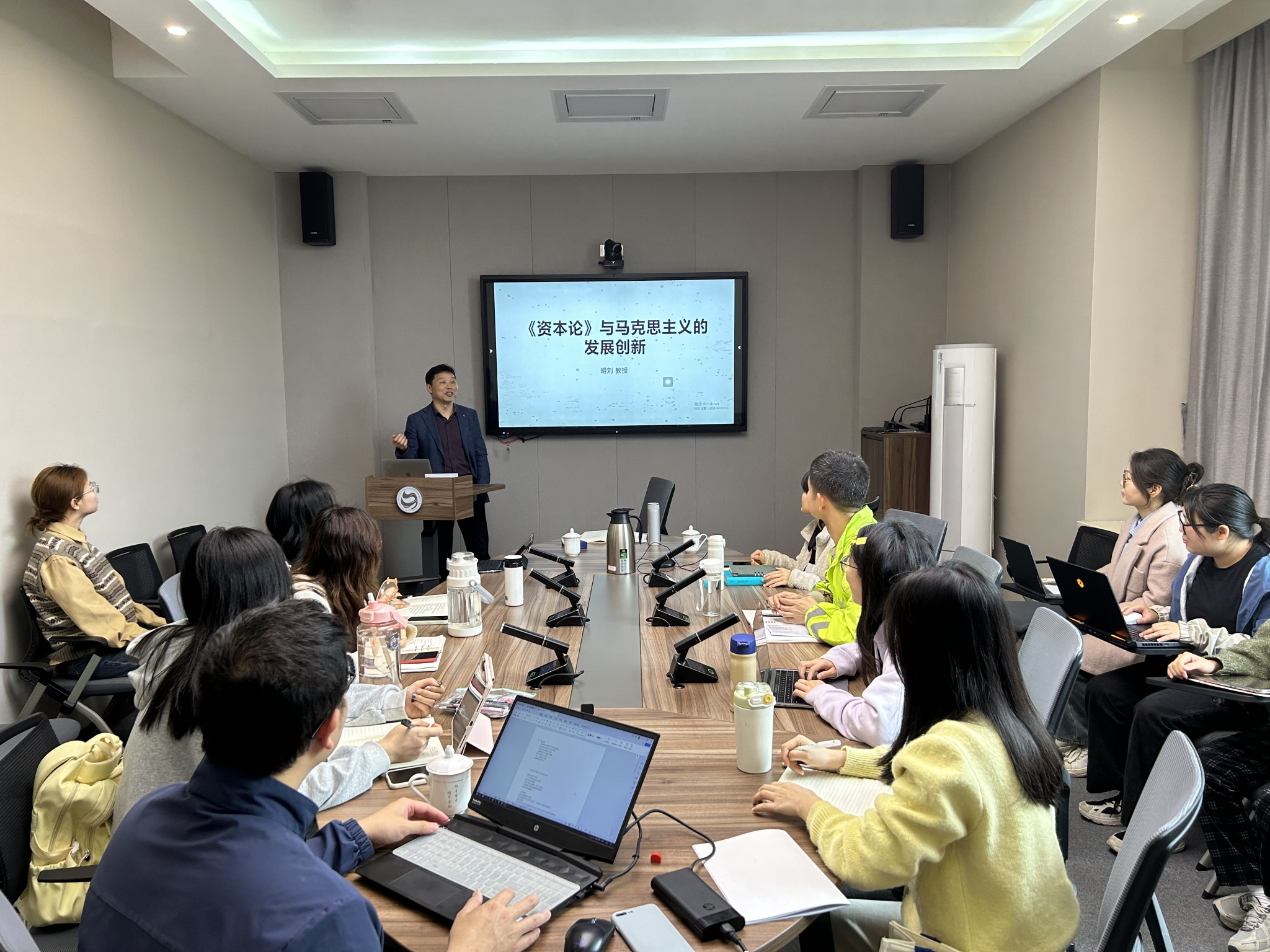 胡刘教授从马克思的早期著作与《资本论》的关系、《资本论》的理论结构与内在联系、《资本论》的主题、视野与地位等三方面展开讲解。首先,胡刘教授认为《1844年经济学哲学手稿》对于整个《资本论》的理论创作具有重大意义,它既不是最高峰也不是“黎明前的黑暗”,而是处于通向历史唯物主义和政治经济学批判途中的重要环节。其次、胡刘教授指出我们要把握马克思早期著作的整体性,通过了解写作背景感受经典著作的真正内涵。最后,胡刘教授总结了《资本论》的当代价值,它是对哲学、唯物史观的具体化,是对资本主义经济关系的深刻剖析,是对科学社会主义的充分论证。会后,同学积极提问,胡刘教授一一解惑。