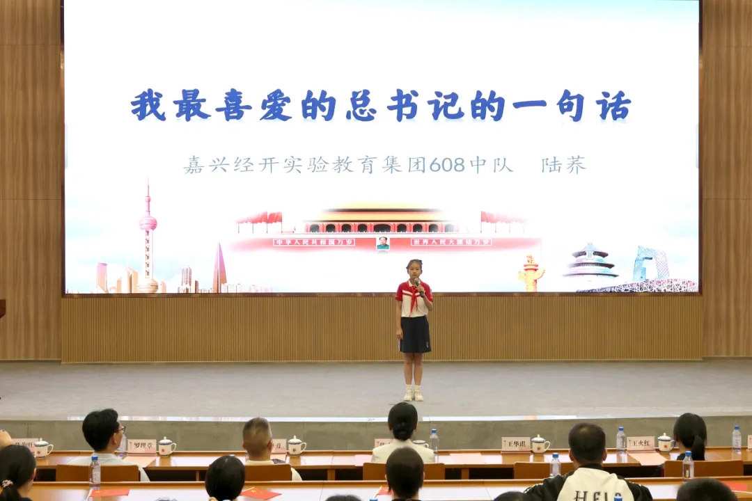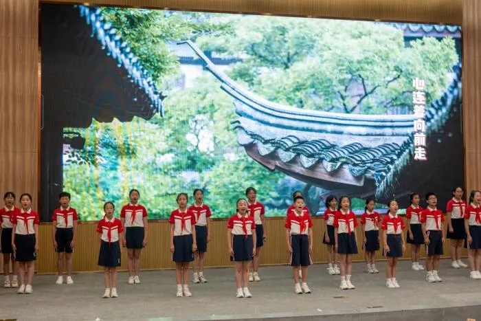 在“齐唱一首歌” 篇章中,嘉兴经开实验教育集团的同学们演唱原创歌曲《烟雨楼忆》,带领在场师生仿佛穿越时光,重回觉醒年代。最后,全体师生共同唱响《没有共产党就没有新中国》,并许下 “请党放心,强国有我” 的庄严誓言。