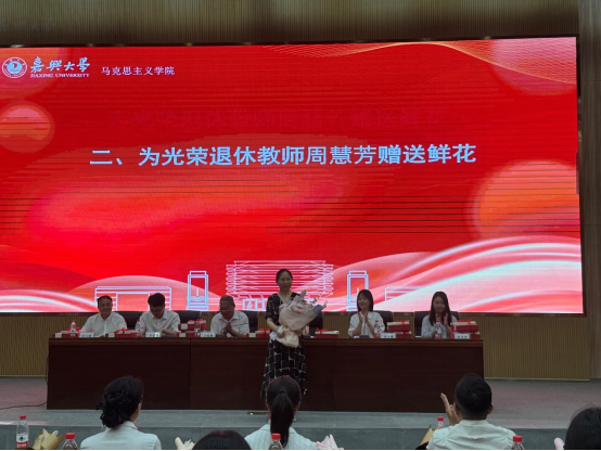 学生代表向荣退教师周慧芳献上了鲜花,全体教师对周老师三十多年来默默耕耘于讲坛、无私奉献的精神表达了深切的敬意。