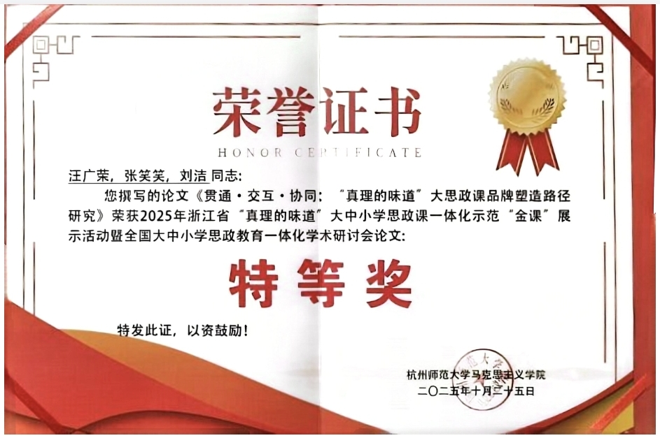 近日,浙江省“真理的味道”大中小学思政课一体化示范“金课”展示活动暨全国大中小学思政教育一体化学术研讨会在杭州举行,评选出“金课”特等奖4项、研讨会论文特等奖3项,我院课程、论文双双获得特等奖。其中大中小学思政课一体化课程“红心向党 红船育人”荣获浙江省“真理的味道”大中小学思政课一体化示范“金课”特等奖,论文《贯通·交互·协同:“真理的味道”大思政课品牌塑造路径研究》荣获全国大中小学思政教育一体化学术研讨会论文特等奖。