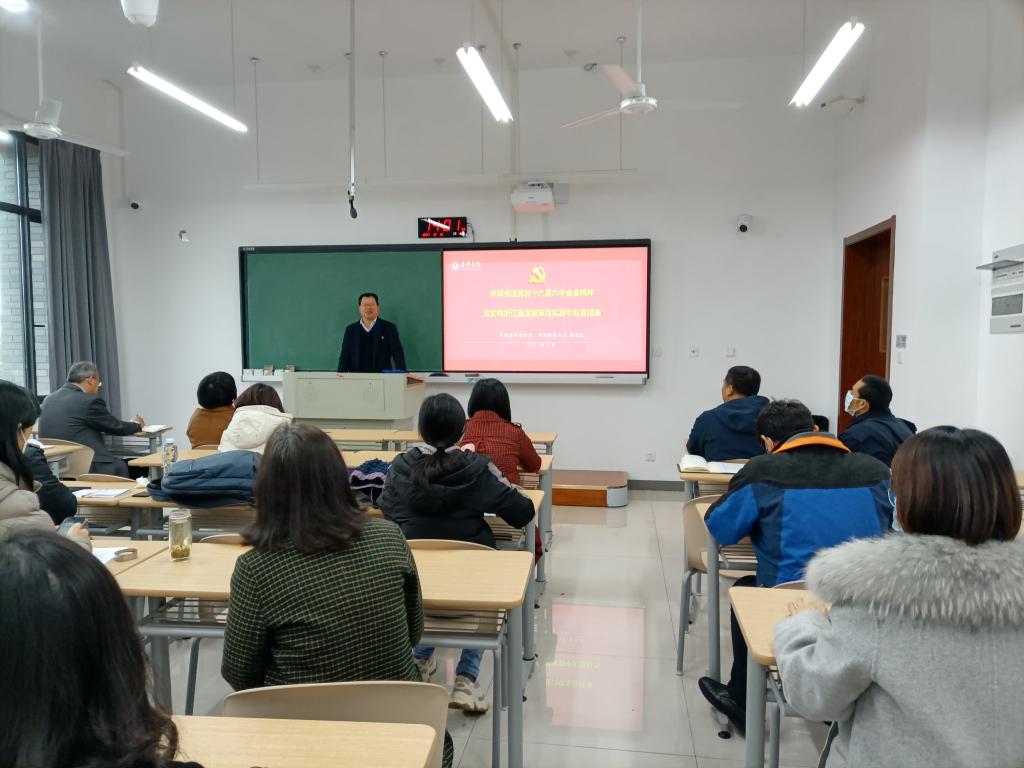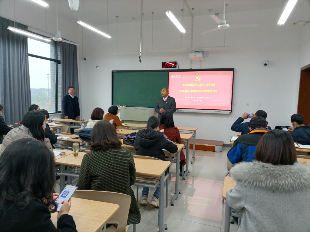 吴云达以“学深悟透党的十九届六中全会精神,在助推浙江塑造变革性实践中彰显担当”为主题,从“党的十九届六中全会的重要意义”、“党的十九届六中全会的丰富内涵”和“从全会精神中汲取智慧和力量,助推浙江塑造变革性实践”三个方面,全面解读了十九届六中全会的三个重要意义:政治意义、历史意义、和战略意义,阐释了十九届六中全会的“一个主题”、“两个确立”、“三次历史性飞跃”、“四个伟大成就”、“五个方面历史意义”和”十个坚持“的丰富内涵,并重点从“帮助大家把经验总结好”、“示范大家把故事讲好”、“引导大家把未来展望好”和“启发同学们把意志锤炼好”四个角度,从党的百年奋斗重大成就和历史经验中,汲取政治、理论、思想、道德、文化等力量,增强自豪感、荣誉感、使命感,助推浙江塑造变革性实践、突破性进展、标志性成果。